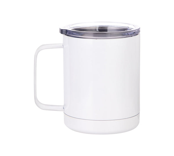 The insulated 12oz Stainless Steel Coffee Cup with handle and plastic lid is ideal for when you are on the go or camping! This sturdy mug can be sublimated and the plastic lid helps to keep your drink in place, and at the right temperature. This drinkware is an ideal gift for the person who is always on the go or who loves to go camping!